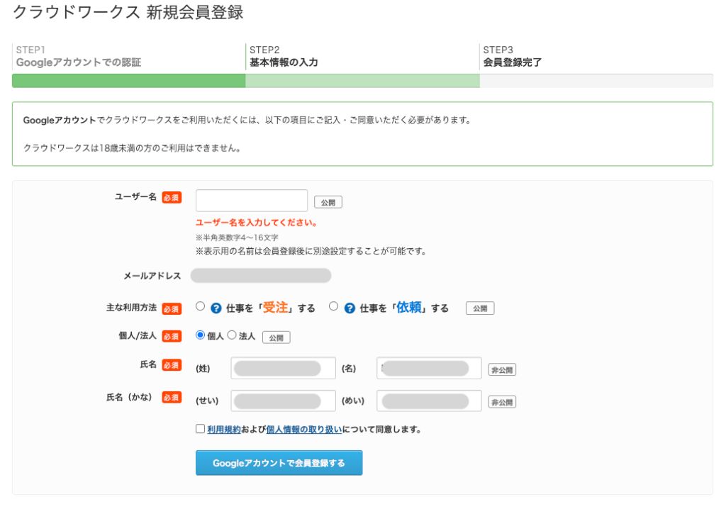 氏名の登録は必ず本名を登録するようにしましょう。稀にお仕事受注用にあだ名や偽名で登録しました、と言う方がいますが、印象はあまり良くありません。理解を示してくれる企業ももちろんいますが、セキュリティ上もあまり意味をなさないのでよほど本名を公開したくない場合は本名で初めから登録しておくと信用を害す可能性を省けます。